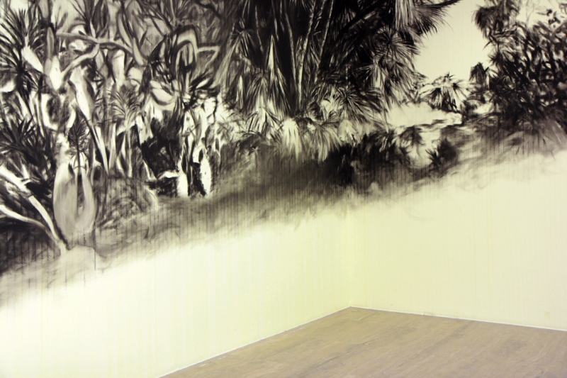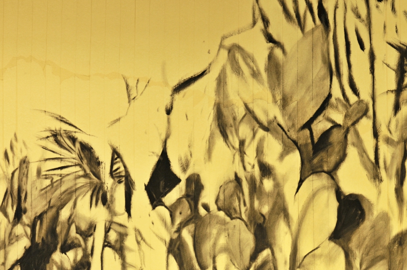 Car plutôt qu’en séquences découpées tableau par tableau, c’est dans une totalité englobante que l’artiste fait pénétrer le visiteur, comme dans une forêt originelle. Impossible d’arrêter la prolifération végétale qui semble se produire en direct autour de lui, elle grimpe à même le mur, traverse l’angle pour investir la paroi contiguë, colonise l’espace, se fait installation, environnement. Pas de cadre donc, mais pas de toile non plus : tout est peint sur des bandes de scotch de carrossier collées sur les murs entre sol et plafond, les striant verticalement comme les falaises de Ténérife, découpant le profil accidenté de ses reliefs et suscitant une tension vers le haut. Sentiment d’immersion et d’étourdissement voluptueux dans un théâtre de verdure à la fois monumental et léger, foisonnant et éphémère !