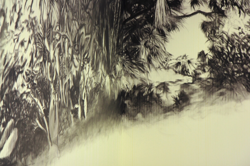 Force et fragilité étroitement mêlées, fugacité et éternel recommencement confondus, la nature est le grand sujet de la Grisone qui a ouvert les yeux au milieu du spectacle grandiose et menacé de ses Alpes natales. Sa manière d’appréhender l’homme et sa relation au monde, son empathie pour la nature sauvage et vulnérable viennent de là. Mais chaque paysage a son caractère propre et bien particulier. Dans la saturation végétale parfois étouffante d’Antanana, son sentiment de nature se fait profondément romantique et son « écriture » lyrique, tandis que sa palette se restreint volontairement à l’austérité du noir et blanc et que ses matières fluides évoluent dans un registre tout en légèreté, sans épaisseurs ni empâtements mais des estompages et des « lavages » qui rappellent les brouillards humides des montagnes tropicales. La peinture à l’huile demeure son arme favorite, mais c’est presque en dessinatrice qu’elle la manie ici. Comme dans une caverne mystérieuse, les photographies prises sur place en guise de croquis sont projetés dans l’obscurité de l’atelier, où seules la peinture noire et la térébenthine racontent, réinventent et recomposent plus grands que nature les efflorescences et les enchevêtrements profus. Tantôt rapide et nerveux, et tantôt précis et minutieux, le geste zigzague avec gourmandise entre le net et le flou, le réel et le virtuel, le figuratif et l’abstrait. Ici les cactus paraissent étrangement anthropomorphes, évoquant un groupe de personnes agglutinées, là les ombres se font denses et ténébreuses, et là-bas le vertige floral s’écarte pour ouvrir une trouée de lumière vers des lointains indicibles. Ce n’est pas d’un paysage qu’il s’agit ici, mais bien d’une fantasmagorie végétale.