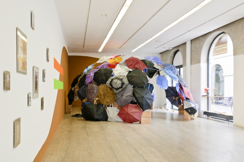 La construction d’une grande yourte géodésique en parapluies cassés au milieu de l’espace sera le centre ouvert d’une installation en tableaux trouvés, sculptures, photographies, dessins et textes qui se propagent dans l’espace et sur le mur.