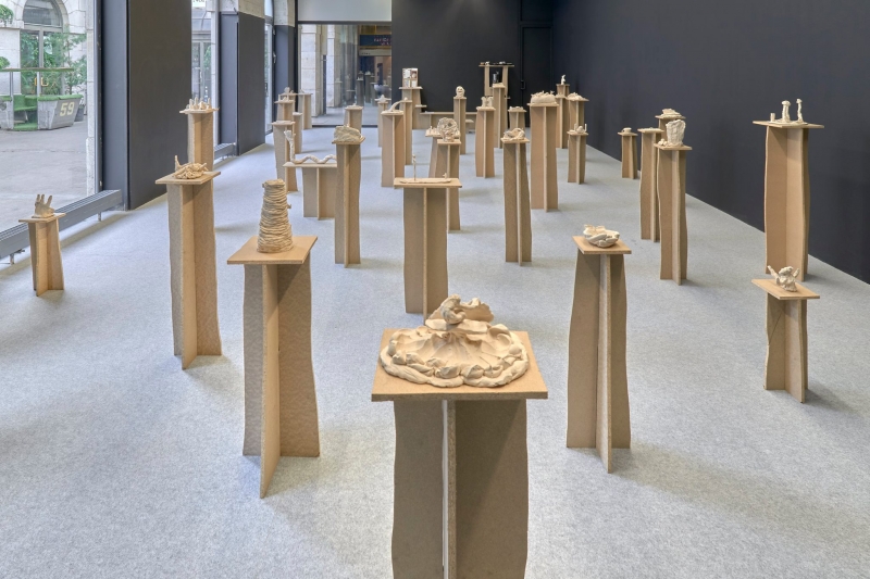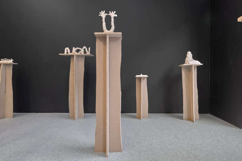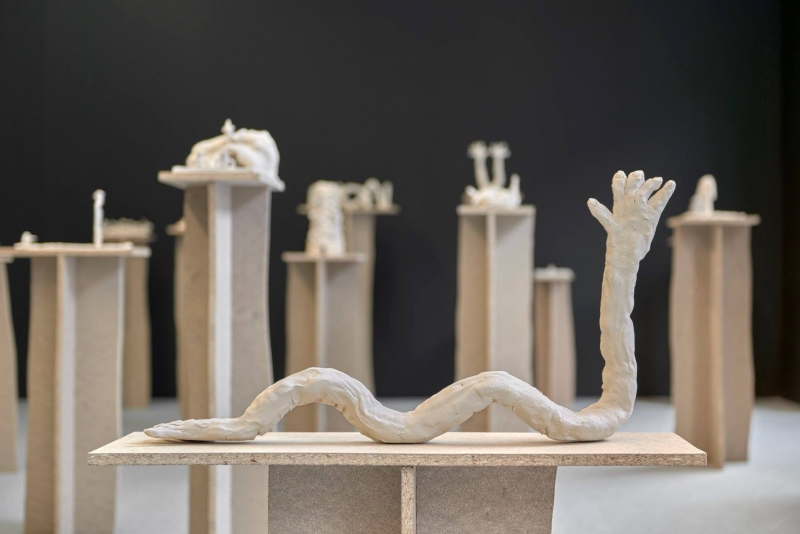 Le titre de l’exposition se présente à nous tel une énigme. De quelle eau André André nous parle ici ? Peut être celle qu’un personnage contemple, l’eau qu’il contient, l’eau partie de la terre cuite et asséchée ? Face à toute cette incertitude, André façonne des mains, des mains qui offrent, qui prient, certaines qui font un petit peu n’importe quoi et d’autres qui se prennent pour des arbres et deviennent des zones réconfortantes où il ferait bon récupérer un moment.