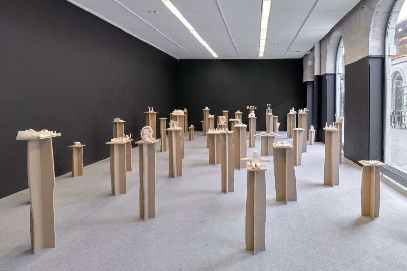 Aux études André faisait beaucoup de sculpture, mais celles-ci n’avaient pas d’endroit où « jouer ». C’est bien connu, les salles d’exposition, ça manque un peu d’utopie. C’est comme ça que la scène de théâtre devient pour elle un territoire ; Le terrain de basket social, le tonneau de sève, l’espace des rencontres entre les différents mediums et les personnes. C’est un endroit où l’existence devient une forme, un objet à malaxer comme un pain de terre. Et c’est à un envoutant basculement d’échelle qu’elle nous invite avec ses mini spectacles figés dans la céramique. Ces petits personnages dans leurs scènettes, c’est un peu nous dans la vie. Nous y voilà tous réunis, sauf que nous ne savons pas ni pourquoi, ni quel est le thème et encore moins qui a organisé cette soirée.