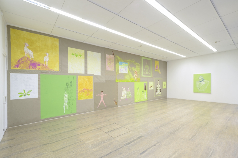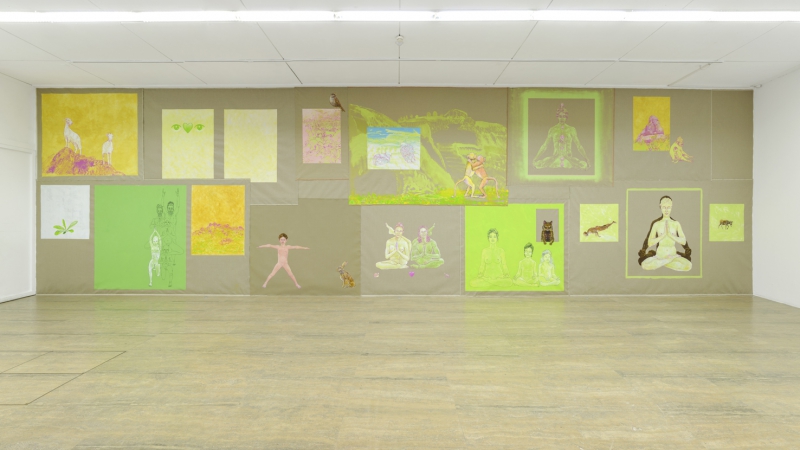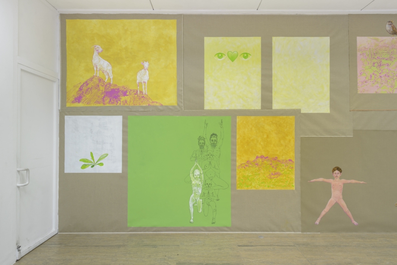 Les peintures sont agrafées au mur, elles forment comme une grande tapisserie. J’ai été inspiré par les fresques des décors muraux à Pompéi. L’œuvre joue ainsi sur des mises en abîme, avec des tableaux dans les tableaux, la couleur de la toile de lin non préparée leur servant d’arrière-plan commun.