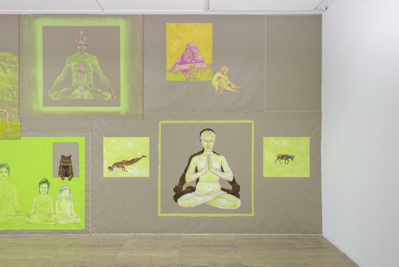 Je peins souvent à partir de mes photographies ou de celles que j’ai trouvées. Pourtant, aucun de ces clichés n’a été pris en Inde. Il y a Montserrat, la montagne sainte de Catalogne, où je me rends en pèlerinage depuis la petite enfance. Et aussi certains endroits que je révère en Valais et à Genève. Les autres photos proviennent d’images trouvées sur Internet, ce sont surtout des occidentaux s’exhibant dans des postures de Yoga. Je les redessine en les imaginant dans la nudité de la vérité.