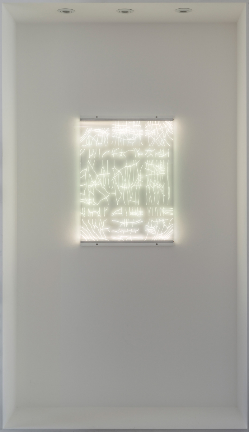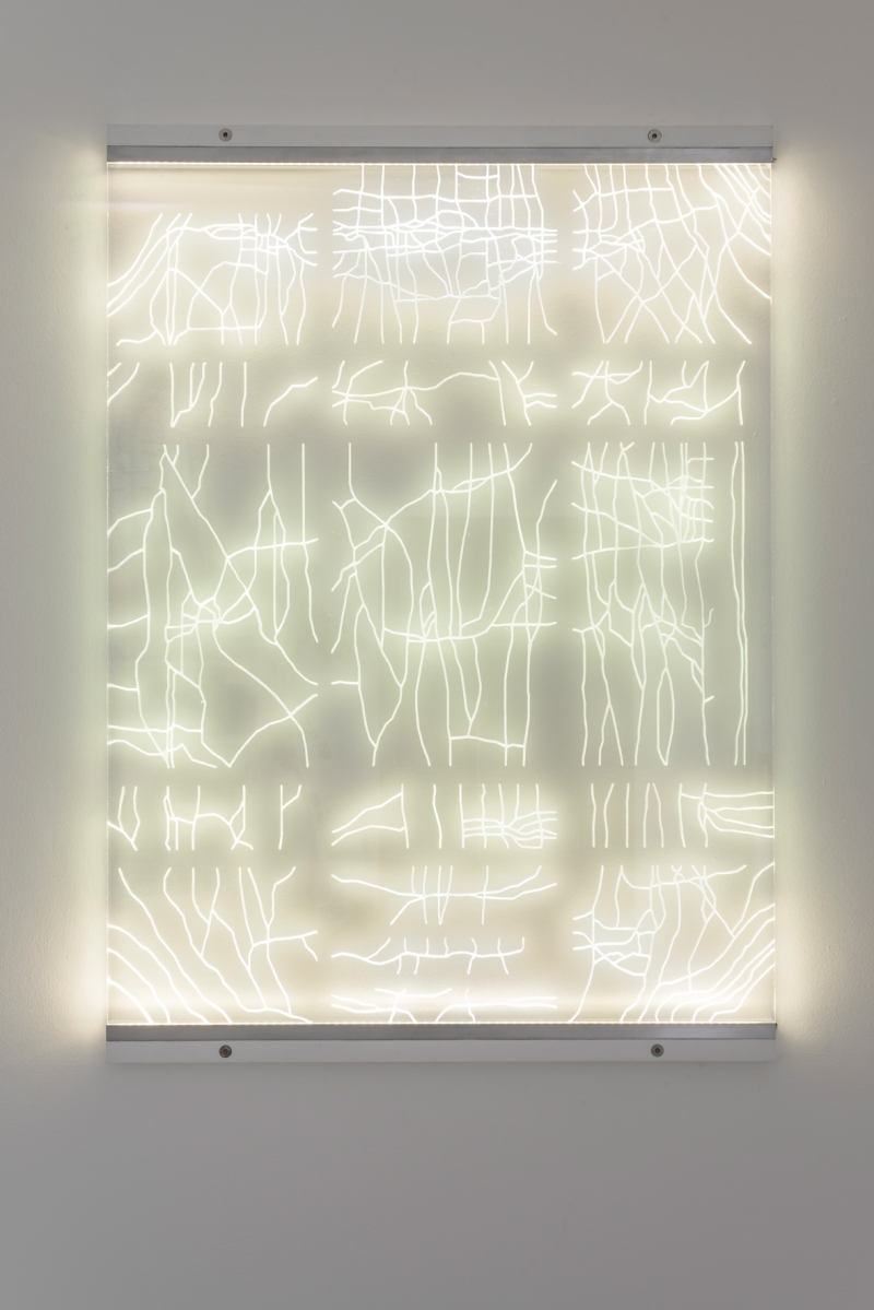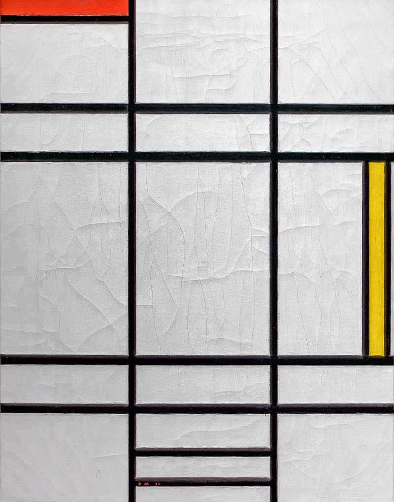 Le tableau est aujourd’hui dans un mauvais état de conservation; les aplats de peintures compris entre les lignes noires qui le composent sont veinés de fissures. Malgré la volonté de l’artiste et le soin des conservateurs, l’objet ne correspond plus à l’œuvre originale alors que ses reproductions inaltérées se multiplient dans les livres et sur internet. Le dessin aléatoire des fissures généré par la dégradation des surfaces de peinture semble pourtant continuer à dire quelque chose; à produire un langage échappant à toute classification et prévision. En fixant ces traces sur une plaque de verre, une composition se superpose et se détache de l’œuvre préexistante. Une œuvre en produit une autre; mutante et irrévérencieuse.