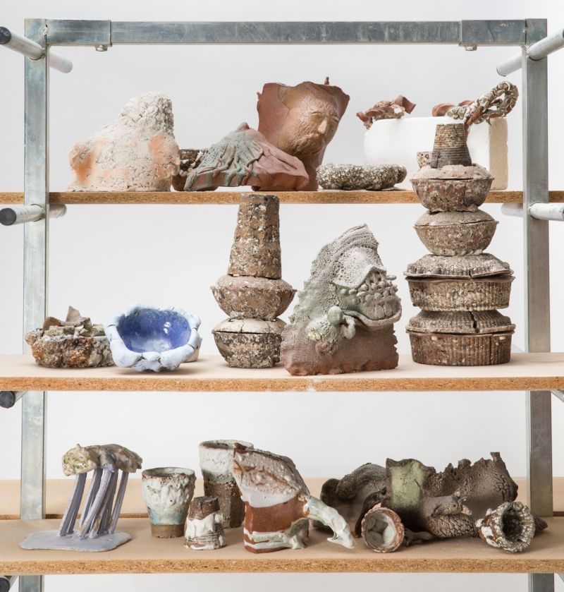 Sans titre (Rutsubo) est un fragment de l’atelier de l’artiste. Des tests de matières, des esquisses tridimensionnelles, des maquettes de projets, des traces de recherches antérieures ont été rassemblés sur des étagères. Yusuké se joue de l’ambiguité de cette pièce, entre carnet de notes et œuvre d’art, afin de permettre de percevoir autrement les démarches des artistes et leur part d’inconscient.