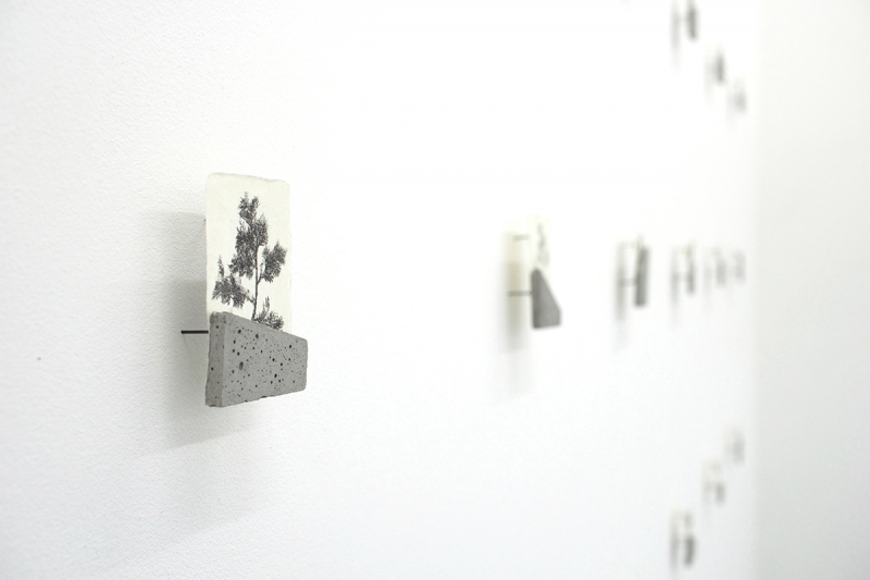 White Cedar présente une série de formats à mi-chemin entre le dessin et la maquette. Au premier plan, un élément fort et robuste, à l’image d’un mur d’enceinte, masque de façon variable un cèdre blanc. L’autre nom donné à cette essence d’arbre est le thuya qui dans sa forme domestiquée est communément employé pour cerner et délimiter une propriété.