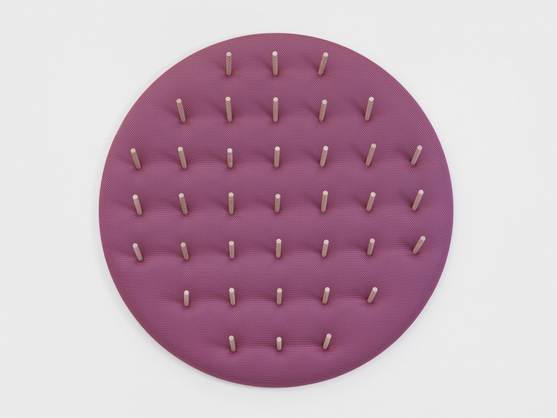 Il en résulte un large cercle capitonné recouvert de tissu strié, hérissé de tiges de hêtre.