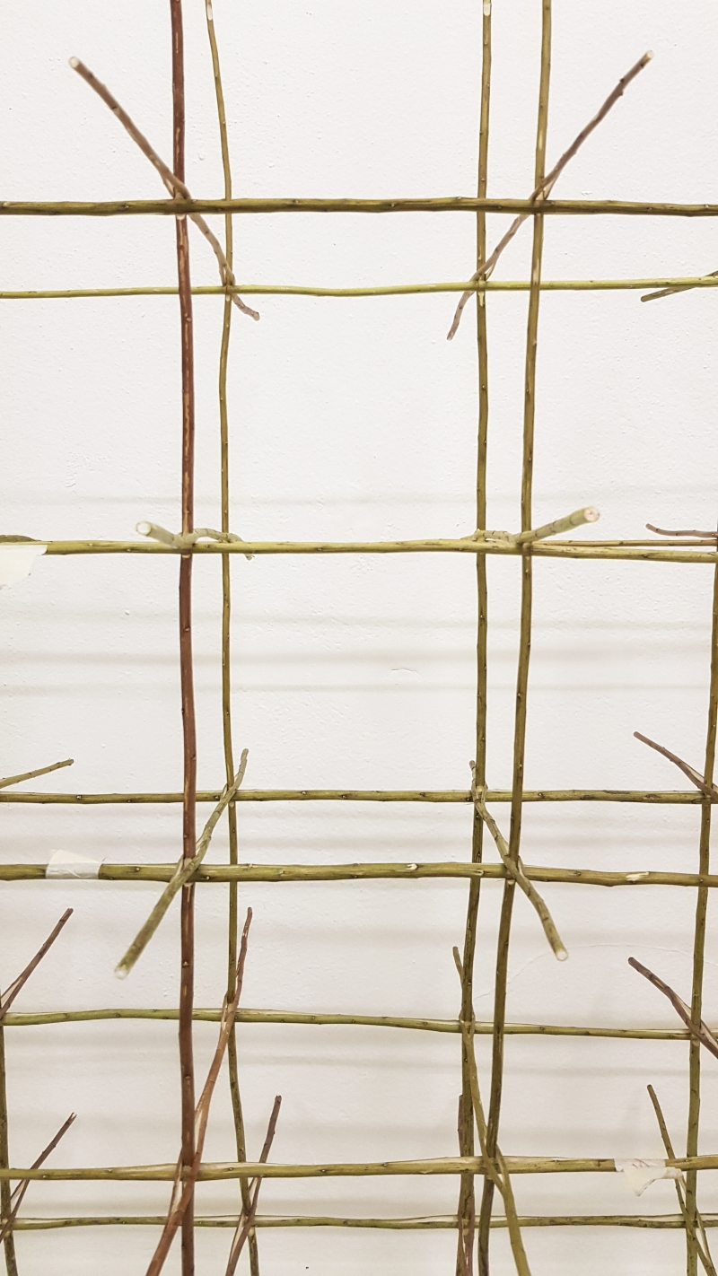 Pour cette Capsule, il a produit une nouvelle pièce réunissant plusieurs techniques qu’il affectionne particulièrement, comme la production de couleurs végétales, le travail du bois et les techniques d’impression. Une structure faite de tiges de solidage, une plante tinctoriale locale, interagit avec une intervention murale. Le jaune qui colore les cercles a été produit à partir de ses feuilles et de ses fleurs. Répétitives et simples, réalisées avec délicatesse, ces formes créent un halo géométrique enivrant qui fait écho à la sculpture. Les tiges créent un quadrillage régulier en trois dimensions qui paraît léviter derrière la vitre. Cette structure légère tient uniquement grâce à des entailles et des assemblages, évitant astucieusement l'utilisation superflue de vis, de clous, de colle ou de tout autre élément parasite et non-organique pour son maintien. La teinte et l’épaisseur des branches, déterminent leur disposition dans la sculpture, l’auteur ne suivant pas de protocole strict et limitant, mais plutôt une intuition logique. Le résultat semble évident: un pattern de droites verticales rougeâtres croisant les vertes à l’horizontale, se détachant du fond par leur couleur, leur régularité et leur finesse. Une tension se crée entre la géométrie formelle et l’irrégularité des composants naturels.