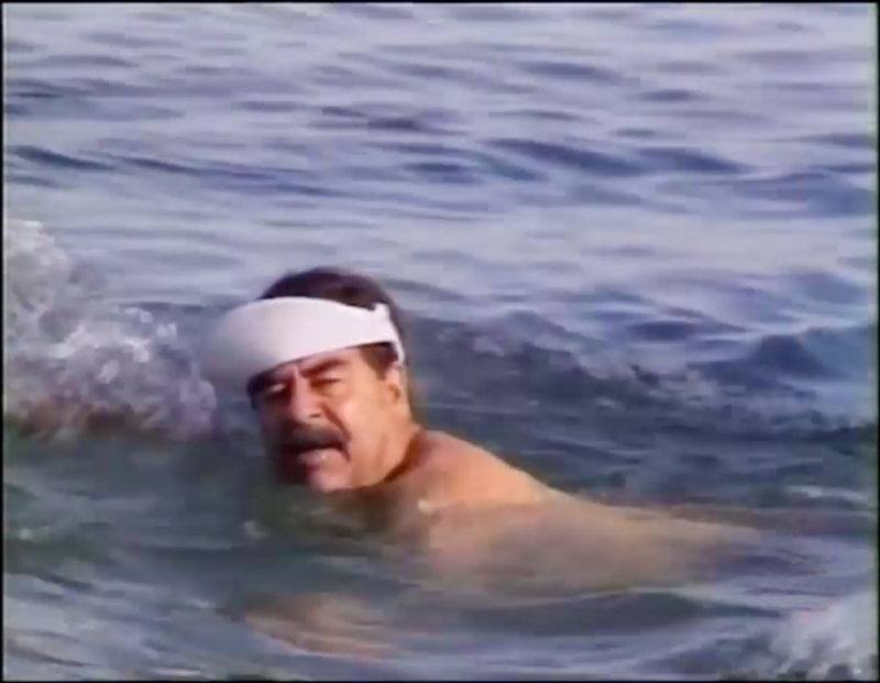 Cette vue extraite d’un reportage montrant Saddam Hussein durant son temps libre avait été récupérée sur une chaine de télévision par Gianni Motti. Celui-ci l’avait présentée au Centre pour l’Image Contemporaine de Saint-Gervais début 2003 sous forme d’installation intitulée « Saddam & George », deux mois avant le lancement des opérations militaires contre l’Irak au nom de la «Guerre contre le terrorisme » initiée suite aux attentats du 11 septembre 2001.