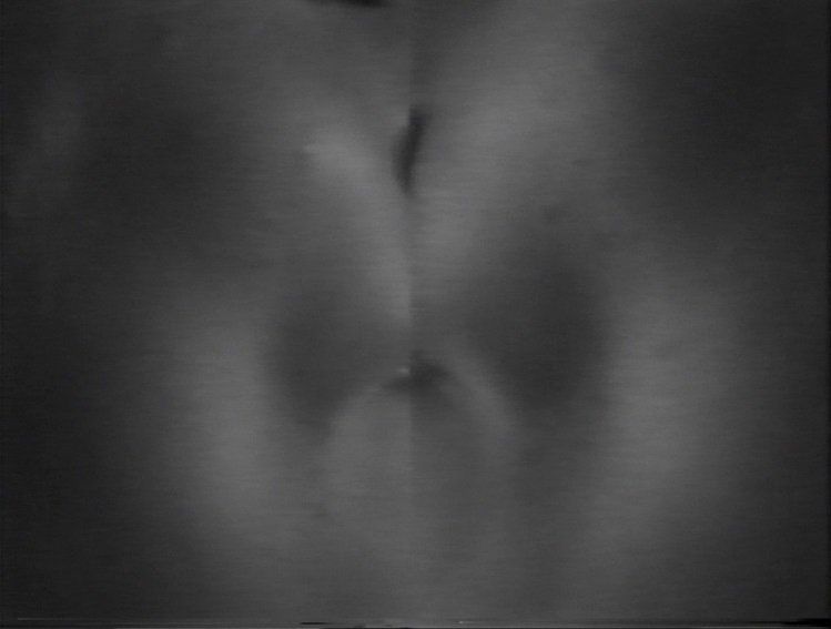Tel un test de Rorschach modulé au gré de variations organiques de niveaux de gris, ce qui est ici offert au regard résiste à l’appréhension de l’esprit. Par un dispositif relativement simple, Muriel Olesen mène, à partir de son corps, une exploration de l’instantanéité et de la réflexivité de la vidéo en circuit fermé (closed-circuit) Pleins et vides, ombres et lumières animent une abstraction à la symétrie disloquée par la partition électronique de l’écran (split-screen). Un faux reflet suscitant réflexion, entre humour et inquiétante étrangeté.