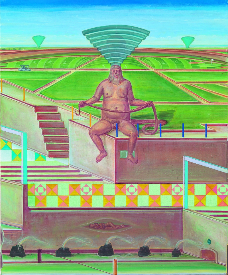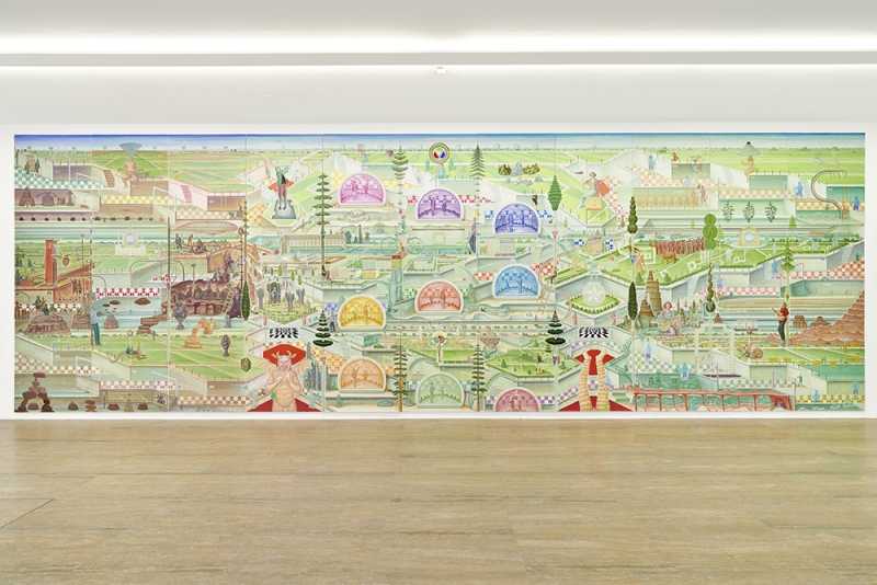 Prenant le contrepied des représentations classiques figurant des cartographies en cercles ou en cônes, le travail de Philippe Fretz s’appuie sur un déroulement linéaire, structuré par un enchaînement en terrasses. L’Enfer est à gauche, le Purgatoire à droite et le Paradis au milieu ; la composition architecturale en « z » est similaire pour chaque partie. Cette construction récurrente associe les différents royaumes et suggère, par l’effet de répétition, la notion de cycles infinis. Les seuils sont quant à eux élaborés par une symétrie verticale, dégageant une superstructure en diamant. Sa pointe, située au centre de la rangée supérieure du Paradis, est figurée par le cercle chromatique de synthèse additive ; la synthèse soustractive marque la pointe opposée, sur la rangée inférieure. Le périmètre du diamant est ponctué par une série d’arbres représentés de façon systématique à la charnière de certaines toiles. Le Paradis, source de lumière divine et physique, occupe le centre du diamant. Cette forme relève également de la réunion du module de base de nombreux motifs géométriques de la composition globale, le triangle. Symbole du Purgatoire et de l’Enfer lorsqu’il est renversé, on le retrouve notamment sur le dallage au pied de chaque terrasse. En outre, deux fleuves marquent des lignes de force horizontales, parcourant la fresque à l’intersection des trois rangées.