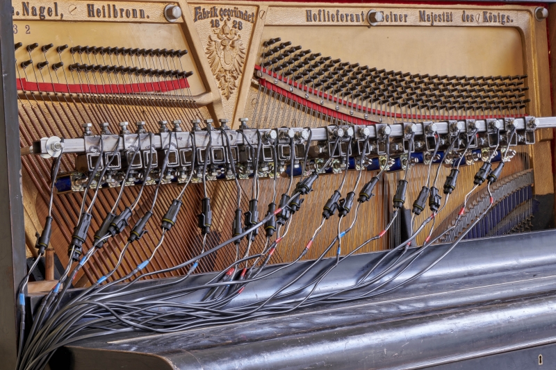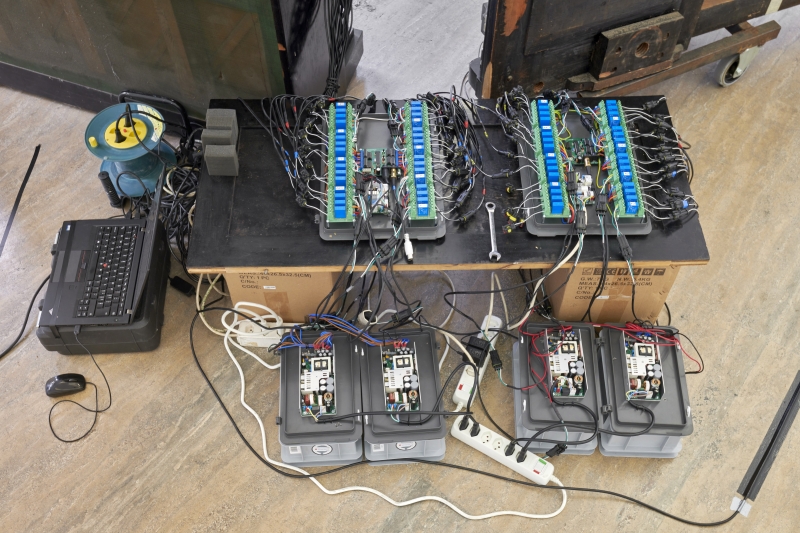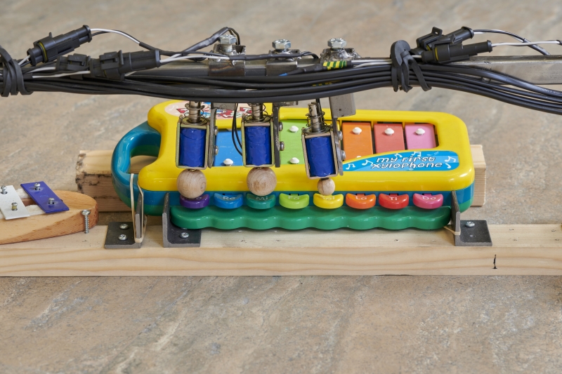 Echorda III, c’est une prouesse à plusieurs niveaux. A celui de l’ingénierie pure tout d’abord : il a fallu (ce fut la tâche de Florent Naulin) imaginer et concrétiser les canaux permettant aux ordinateurs de communiquer de manière fluide avec les terminaisons mécaniques de l’installation – ce qui nécessita entre autres la construction de circuits imprimés dédiés (et le développement d’un savoir-faire certain pour ne pas se perdre dans la jungle des câblages). Le montage demanda lui aussi une bonne dose de concentration – étant entendu que le son produit par le choc des marteaux change radicalement de nature en fonction de la portion de corde sur laquelle il est posté. On est là dans le domaine du bricolage considéré dans son actualisation la plus noble.