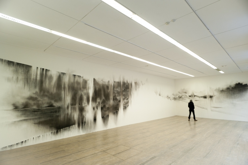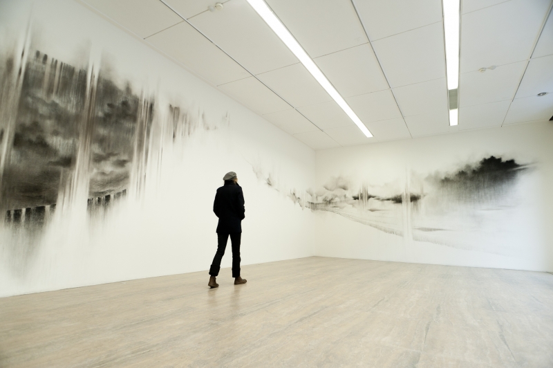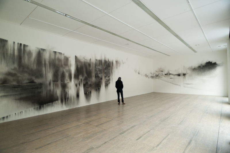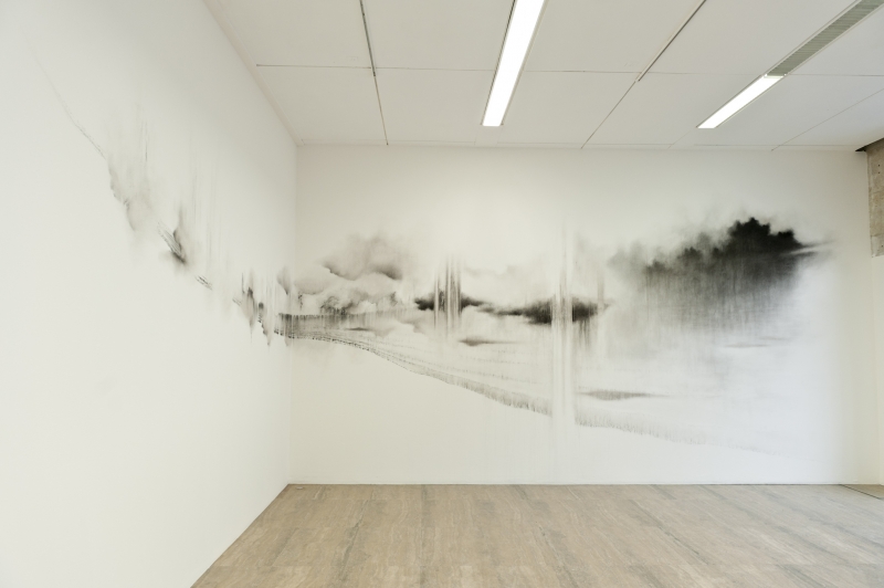 Une esquisse éphémère de 21 mètres sur 3.80, exécutée au fusain à même les murs perpendiculaires de Halle Nord, invite son spectateur à entrer en elle. Le sentier menant au coeur d’un imaginaire organique guide le voyageur dans un monde de formes imaginaires, conduit le regard à faire le tour de l’étrange forêt d’amalgames qui se décline sur l’horizon du mur blanc. Ainsi décentré, le regard à distance s’immisce dans ce relief inconnu et saisissant, contourne des volumes que l’habitude amène à interpréter, cherche la sortie de ce labyrinthe d’effets d’ombres et de lumière qui ne se ferme pas,