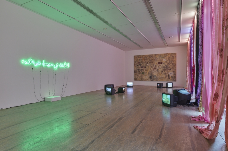 Sur le grand mur de l’espace d’exposition clignote la pièce lumineuse Ana kont fi swisra, shuwaya keda. Réalisée en leds de couleur verte, elle transcrit en caractères arabes manuscrits une mystérieuse expression cairote qui mêle subtilement l’idée de la prison et de la Suisse.