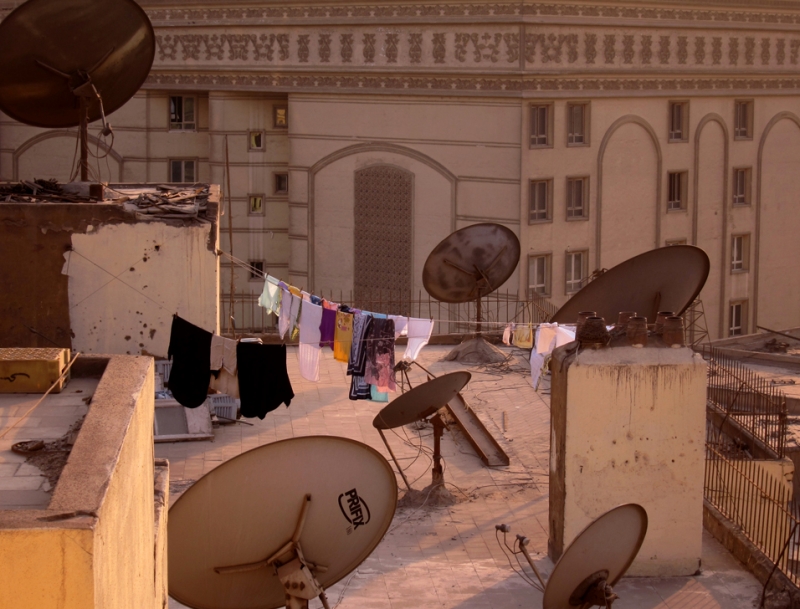 De la porte ouverte nous parvient une cacophonie de sons avant de discerner au sol un assemblage de téléviseurs cathodiques qui diffusent simultanément des boucles vidéo captées intuitivement au Caire: .remember #2.