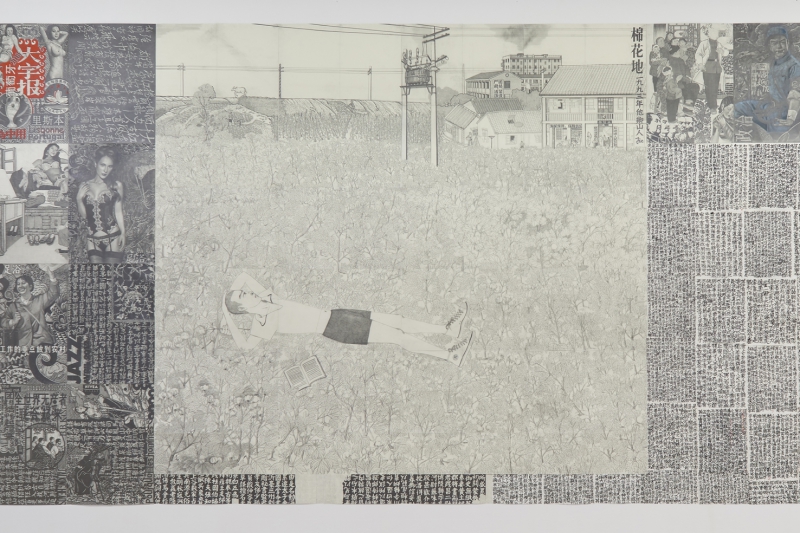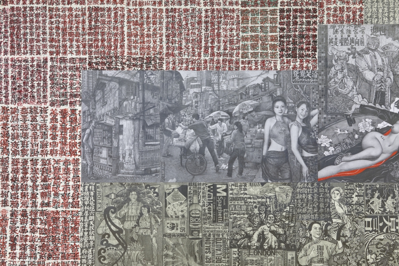 Dans chaque dessin, Qiu Jie s’inspire d’images existantes extraites d’une infinité de sources (journaux, publicités, peintures, photographies – passées, présentes, personnelles, publiques, narratives, descriptives, sociales, politiques -). Ce terreau initial catalysant l’imagination et la créativité de l’artiste est l’origine d’une étonnante recomposition : Qiu Jie, tel un romancier, fait appel à ces personnages ou éléments de contexte existants pour écrire sa propre histoire. Ces composants sont alors imbriqués, reliés, au service d’une intrigue et d’un schéma narratif. Deux niveaux de lecture découlent de cette méthode d’écriture : la nouvelle histoire que l’artiste compose se mêle à chaque histoire individuelle, à l’origine du dessin. Chaque élément est donc indépendant tout en étant lié au tout.[interprétation personnelle]