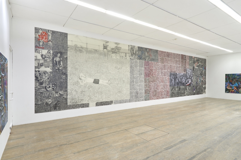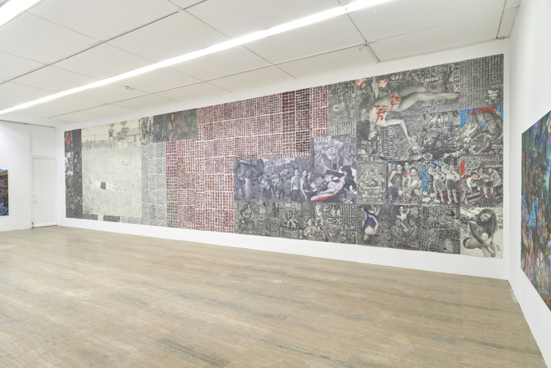 L’invitation de Halle Nord est l’occasion pour moi de faire une exposition d’envergure à Genève, chose que je n’ai pas fait depuis longtemps, et ainsi de montrer au public le travail que je réalise depuis de nombreuses années. Je vais pouvoir montrer dans cet espace que j’apprécie pour son architecture, mes dessins et mes peintures d’une manière conséquente et de façon rétrospective. J’ai imaginé investir dans son ensemble les deux grands murs du lieu en profitant de la surface de ces derniers pour sortir de l’accrochage traditionnel. Sur le plus grand mur, sera réunie une sélection de dessins en encre de chine et crayon réalisés depuis plus de 20 ans. Une multitude de dessins noir et blanc, sous forme d’un grand ensemble, mélangeant le premier dessin du genre réalisé en 1993 jusqu’au travaux plus récents. Un accrochage sans fin, ni commencement, composé de plusieurs feuilles de papier dont la surface fragmentée donne à l’ensemble un effet d’artefact historique. En dialogue, sur le mur du fond, seront accrochées un tout nouveau travail de peintures très grand format à l’huile de couleur. Ces dernières n’ont jamais été montrées. Cette exposition est l’occasion de réunir pour la toute première fois ces différents axes de travail. Le passage à la couleur a été pour moi un challenge car j’ai du sortir de ma pratique habituelle. Ce sera pour moi une grande surprise de voir le résultat.