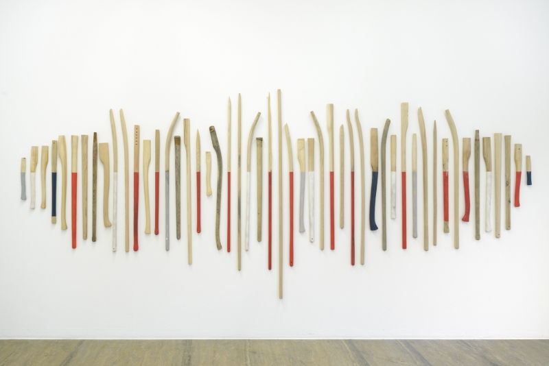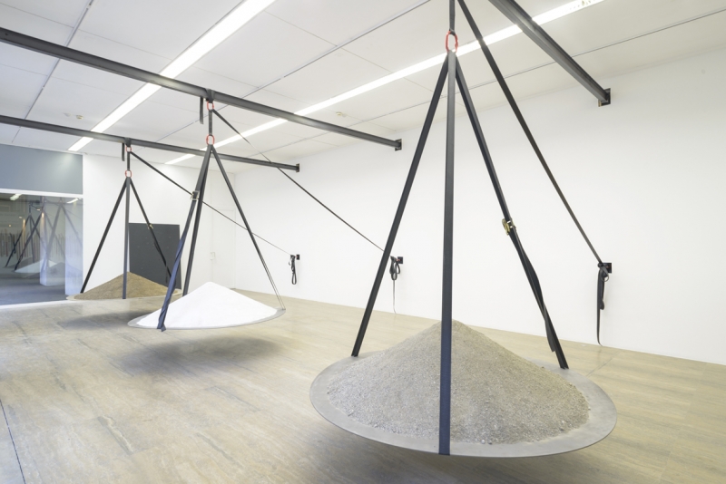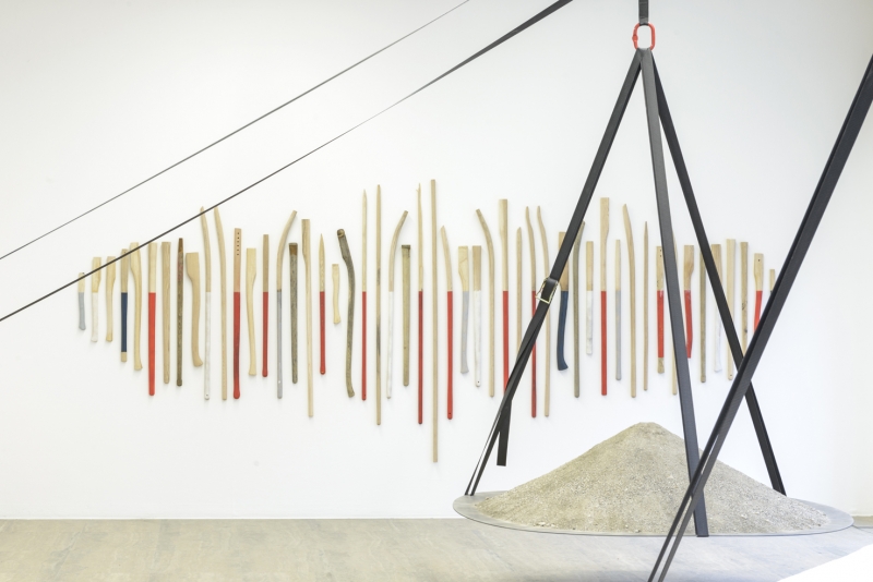 Contre un mur, un grand plateau de granit noir criblé de trous (Rafales) évoque l’idée d’une blessure, d’une meurtrissure ou d’un manque alors que 100 manches d’outils colorés dépourvus de leur tranchant d’acier (Sleeves without tool) font figure d’acte de résistance. A nouveau, l’idée du conflit est omniprésente dans ce travail, comme pour évoquer que les équilibres, même fragiles, sont toujours le jeu d’un rapport entre forces contraires. Il est alors question de dynamiques physiques ou sociales, d’un rapport de force ou de pouvoir.