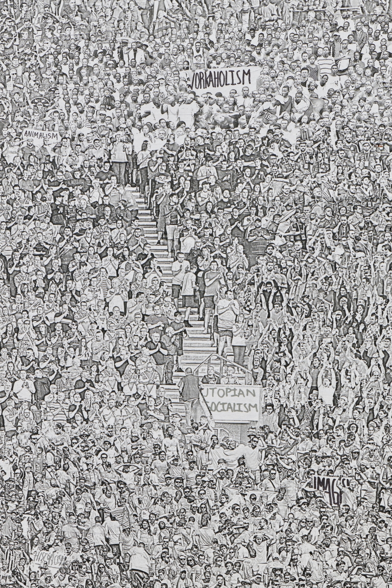 Enfin, tel un décor au fond d’une scène, Atelophobia, un papier peint, constitue le troisième volet de « Mordicus ». Si la performance Nolens Volens générait un déplacement, si l’installation vidéo Hic et Nunc est en mouvement constant, Atelophobia se présente comme l’arrêt sur image d’une foule en délire dont les revendications auraient été censurées. Cette dernière est composée à partir d’images principalement glanées sur la toile, de manifestations, de grèves, de publics divers, rappelant combien nos stades, nos aéroports, et nos rues sont comparables à des fourmilières. Autant de situations où l’individu se fond dans la masse pour une cause commune. Sur les pancartes et autres supports à disposition, à la main, Stéphane Blumer a égrené une liste de mots se terminant par -isme. Atelophobia signifierait « la peur de ne pas faire assez bien » ou « la crainte de l'imperfection ». À force de -ismes – suffixe employé essentiellement pour désigner les traits de caractère, les idéologies, les métiers ou certains courants d’art – le monde n’est-il pas présenté une fois encore sous son aspect le plus cryptique, voire artificiel ?