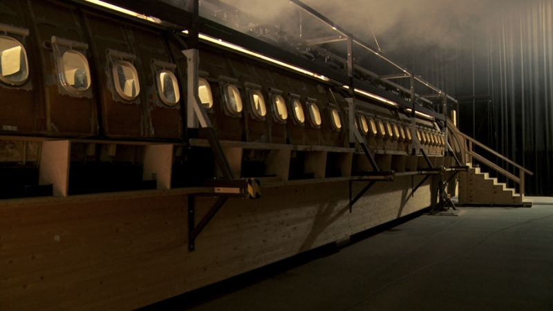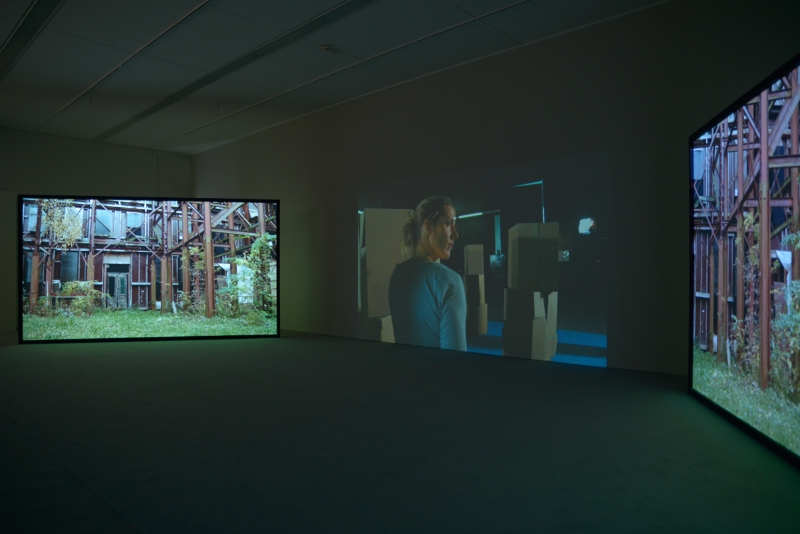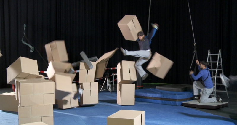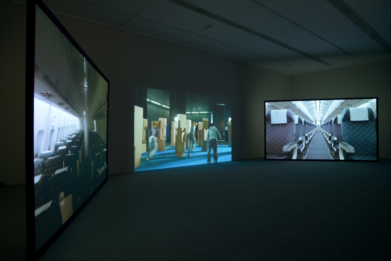 L’installation Offscreen présente trois écrans qui plongent le visiteur dans trois scénarios visuels projetés parallèlement tout en étant accompagnés par un même récit en voix off : le récit d’un voyage « en zones de crises ». Passé le premier mouvement de caméra balayant un rideau de scène, le théâtre peut commencer. Sur des fonds d’images de qualité, qui ne sont en rien illustratives, la voix d’un homme raconte alors non sans fierté cette expérience qui l’a fait « participer à l’histoire ». Comme dans The Easy Way Out, ou dans Setting, dans Offscreen Gabriela Löffel ne pointe pas sa caméra précisément sur le sujet dont il est question. Elle trouve des moyens imagés de mettre en perspective les propos recueillis en insistant sur le décalage qui existe entre le réel et le vécu, la projection et l’expérience, la réalité et la mise en scène. Orchestrés par l’artiste, les constructions de boîtes en carton, les travellings à l’intérieur et à l’extérieur d’un avion de ligne, les répétitions de cascadeurs professionnels soulignent l’artifice, le décor, la rupture d’avec le vrai monde.