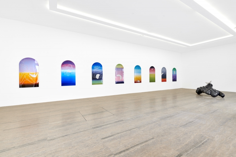 Plaquées sur le métal par l'onde de choc d'une supernova, des silhouettes élastiques de cartoons étirent les lignes de leur contour. Elles semblent prêtes à sombrer et disparaître dans l'abstraction horizontale des dégradés chimiques. Tel un coyote qui mouline des pattes au-dessus du vide dans cet instant de tension qui précède la chute, tout le potentiel de mouvement concentré dans la suspension en l’air d'un corps distordu par l’accélération est saisi ici. En arrière-plan, une déclinaison sereine d’horizons de nuances est offerte à notre regard. Ces teintes coulent sur les capots rutilants des voitures volantes d'une Californie fantasmée, sur les vitraux opaques d'un temple de la couleur, ou peut-être sur les hublots arqués d'un aéroglisseur fendant les eaux miroitantes d'un archipel. Avec cette série de peintures, Flora Mottini se saisit des possibilités d’un processus de traitement industriel de l’aluminium - l’anodisation - pour en faire émerger une esthétique de la transition, toujours plus tentée par le minimalisme.