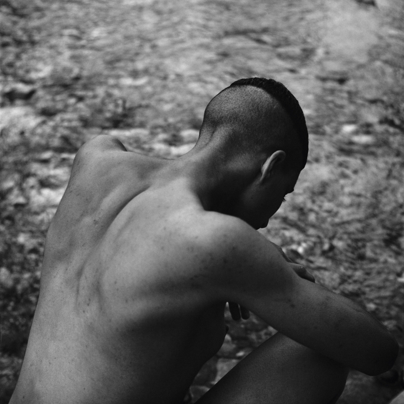 eden levi am magnifie l’ambiguïté de genre. Il désexualise les corps, les dégénitalise. Débinarise les clichés esthétiques du nu. Questionne. Déplace les attentes. Photographie des corps cailloux, des mains d’eau, des yeux rochers. Rend mutant.e. Met à l’honneur une génération qui se réinvente en tant qu’espèce, qui décide de son propre langage. Qui, par ce biais-là, touche à l’immortalité. L’usage du procédé photographique analogique monochrome brouille les repères temporels, caresse une réalité sourde. Amplifie les silhouettes sculpturales. Un monde rêvé en noir et blanc, une vérité frontale. Une technique à rebours d’une pratique numérique actuelle. Un appareil reflex bi-objectif qui permet de poser un regard indirect sur la nudité et l’autre en face. Qui enregistre le réel, en témoigne.