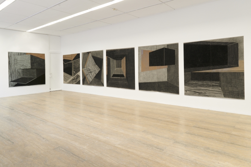 Rappelons que la pratique du dessin est née dans le contexte d’un chantier, un bâtiment en cours de transformation qui a laissé de la place à un lieu de travail temporaire. Dans cet atelier éphémère abandonné à la bohème – fait de matériaux bruts ou d’emballages déchirés, ouvert à de nouvelles expérimentations, le travail de l’artiste s’est fait plus léger dans sa logistique : pas besoin ni de déplacer ni de porter ni de ranger les éléments de mobilier qu’elle a l’habitude d’installer, d’empiler, de retourner à bout de bras. Tout se joue dans un même format, frontal, sous un angle bien précis induit par le dessin. L’espace de la feuille est aussi bien habité par le vide que conquis par des accumulations d’objets divers difficilement identifiables. Enfin, dans l’accrochage, les enchevêtrements de lignes juxtaposés de façon sérielle s’organisent en séquences et promettent au regardeur de se plonger à l’intérieur des compositions. Sans perturbations, sans crissements, il y a une invitation franche et sans détours dans les méandres des tons cassés qui contribuent à rythmer l’ensemble et peut-être amorcer un début d’histoire…