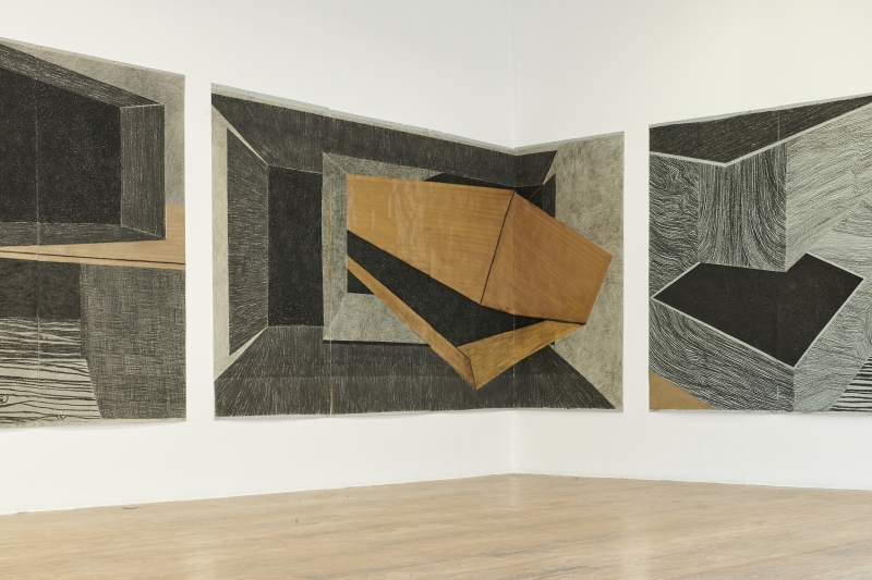 Le dessin de Virginie Delannoy n’a rien d’intime. Il se déploie sur des formats « grandeur humaine ». Des formats qui se justifient par l’amplitude du geste, le rapport au corps et le possible recul sur l’image. Il se réalise sur du papier isolant – prévu initialement pour protéger les sols – à coups de rubans adhésifs, de fusain ou de craie noire. Autant de matériaux inextricablement liés au contexte de la construction. Le scotch ne répare rien, il colore, luit et joue de contraste avec la poussière mat du fusain. Les lignes n’esquissent rien, elles s’étirent en des points de fuite construisant du solide et de l’abstrait en même temps. Sur le papier, aucune ligne ne résultera d’une intuition du moment ou d’une intrusion du hasard. Tout correspond au contraire à une observation de la réalité. Car avant de passer au dessin, Virginie Delannoy réunit des objets, tels qu’un carton pris dans un tiroir en équilibre sur une étagère ou un amas de briques ou de boîtes.