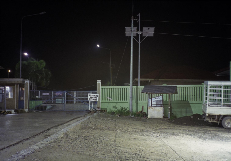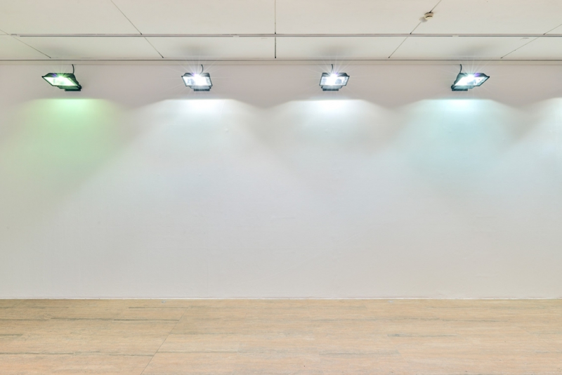 HALID et composée de six projecteurs contenant des lampes à décharge haute pression (metal Halide). Ils éclairent un mur de l’espace d’exposition de manière homogène. A intervalles irréguliers un ou plusieurs projecteurs s’éteignent et créent un « trou » dans l’espace éclairé. Comme une faille dans un système. L’installation rappelle les dispositifs de surveillance aux frontières, les éclairages de zones de fret. Ce sont des projecteurs utilisés dans des espaces incertains dont on veut contrôler l’accès. Par métaphore, les projecteurs qui s’éteignent laissent une brèche ouverte au passage ou alors sont les éléments défaillants d’un dispositif que l’on veut sécurisé.