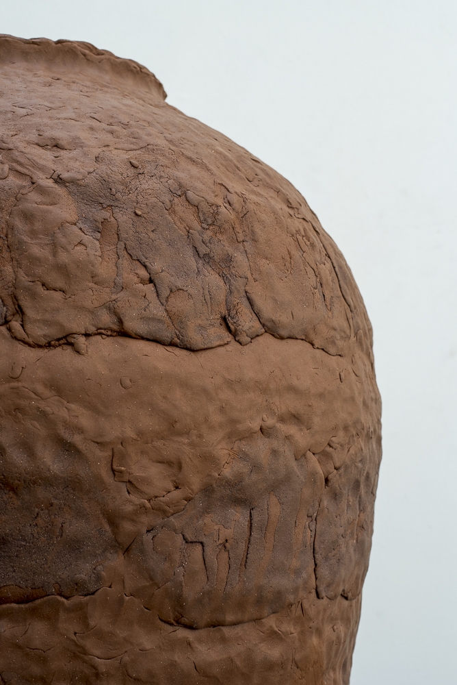 Dans le travail d’Anja Seiler, les reliefs de la peau sont multiples, complexes et hétérogènes. On y trouve boursouflures, éraflures, tuméfactions, rides, crevasses, cicatrices... Le contact est rugueux mais ne laisse pas indifférent et frappe par son caractère si vivant. La peau faite d’argile, véritable enveloppe tactile, interroge, constate, s’étonne, crie, se noie parfois... Et témoigne, toujours. A travers la matière de l’argile, cette peau témoigne d’une histoire première, universelle, et archaïque. Ainsi l’amphore nous renvoie à la symbolique du contenant premier, singulier, des tous premiers temps de la civilisation. Ici la peau-argile nous raconte une histoire de l’humanité, celle où pour survivre, il faut pouvoir circuler, échanger, transporter les denrées essentielles au quotidien des humains : l’huile, l’eau ou le vin. Et mille autres choses. Et c’est cette même peau–argile qui revêt les multiples visages que nous propose Anja Seiler. Ils nous frappent par leur singulière humanité : on les imagine tantôt interrogateurs, tantôt résignés ou tantôt frondeurs, ou simplement écrans de nos propres émotions, de nos propres interrogations. Et une fois cuite, la terre d’argile nous ramène aux contours et aux reflets d’un brun cuir animal, organique, à distance d’une origine pourtant si minérale. La peau-argile devient narration, parchemin, réceptacle d’une histoire oubliée et pourtant si présente, celle des humains en quête d’origine, de sens, de mise en sens.