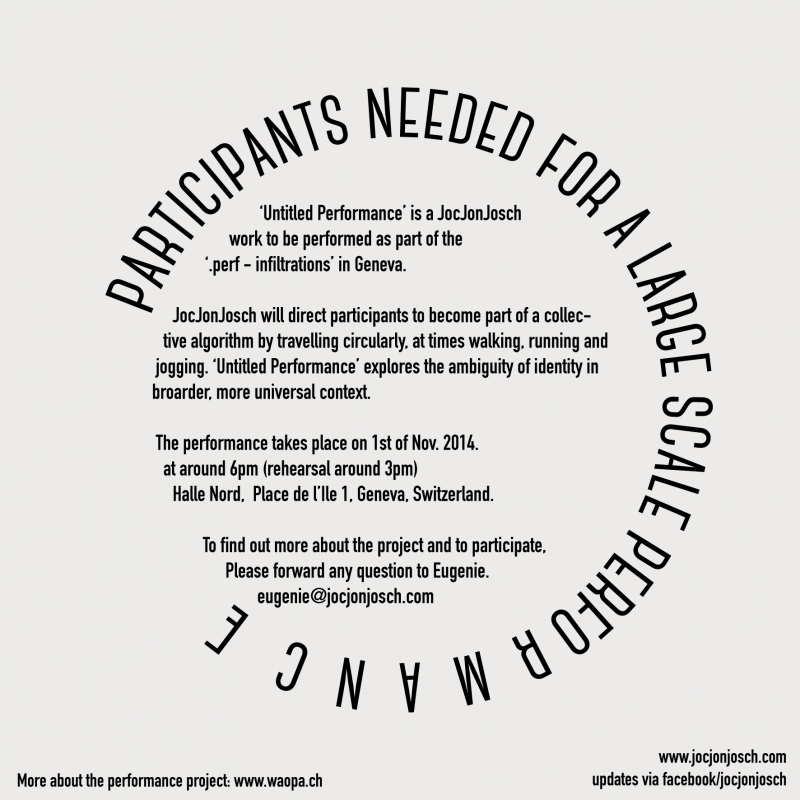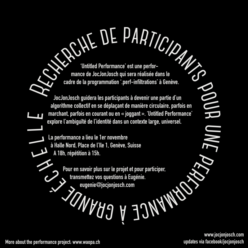 JocJonJosch guidera les participants à devenir une partie d’un algorithme collectif en se déplaçant de manière circulaire, parfois en marchant, parfois en courant ou en « joggant ». ‘Untitled Performance’ explore l’ambiguïté de l’identité dans un contexte large, universel.
