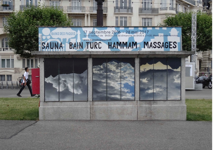 Depuis que j’ai commencé mon travail photographique je n’ai pas arrêté d’interroger le paysage en même temps que je l’enregistrais. Partition, renversement, montage sont les trois opérations qui ont conduit au triptyque présenté jusqu’en décembre 2016 à l’entrée des Bains des Pâquis.